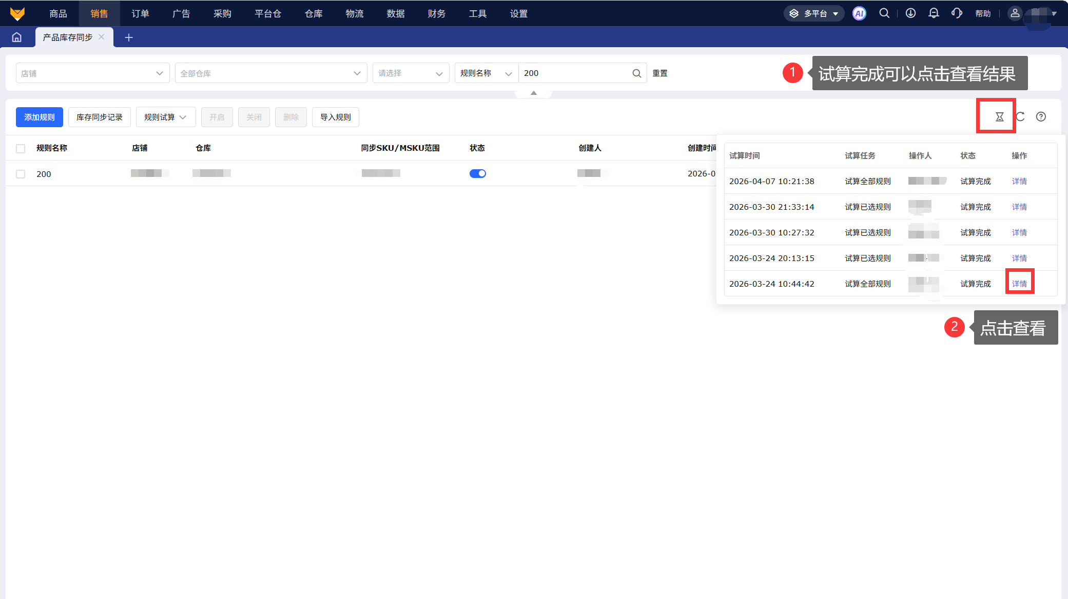 支持筛选店铺、仓库、状态、规则名称以及SKU查看,点击重置可清空筛选项;