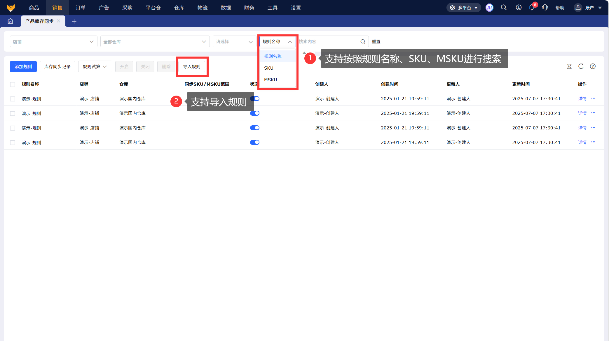 切换多平台模式,在【销售】-【产品库存同步】页面查看
