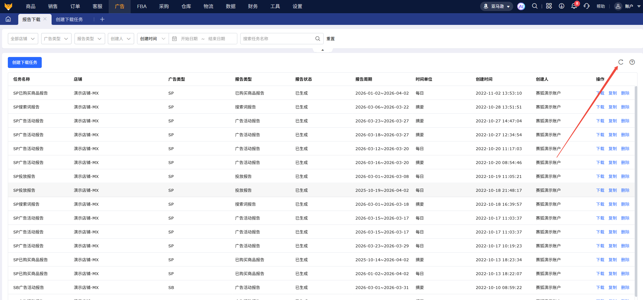 点击“创建下载任务”,添加需要下载广告数据的店铺,选择广告类型、报告类型,选择时间单位、报告周期,选择下载指标最后点击“确定”,即可创建任务成功;